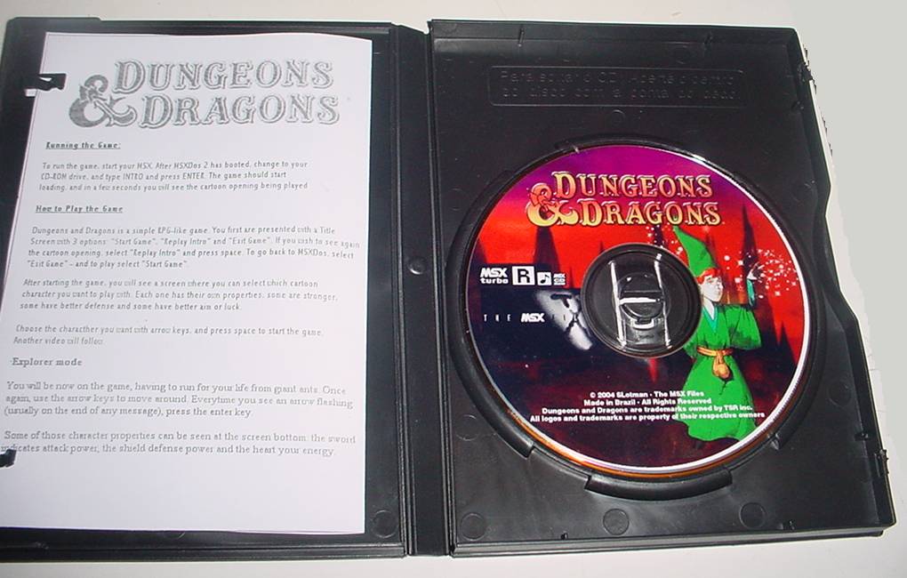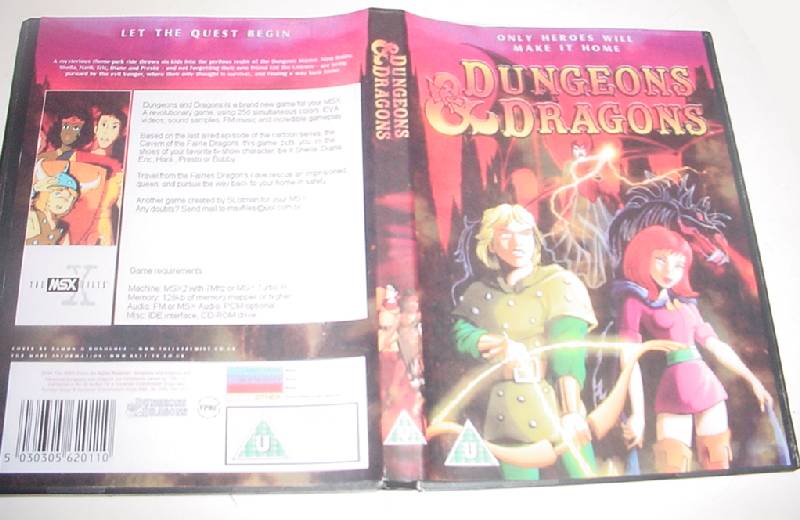 Dungeons & Dragons is a game totally based on the TV animated cartoon show of the same name. The game was created and sold on MSX-Jaú 2004, where a small limited batch was released to MSX computer fans, in CD-ROM with DVD cover. With videos from the cartoon being played on the game using the EVA tecnology, you go through the story of the last tv-aired episode, "Cave of the Faerie Dragons". Counting not only with the videos to tell how the story unfolds, the game also uses the 256 colors from screen 8 to achieve a graphical level few times seen on a MSX. And it still uses MSX turbo-R PCM to play a sample on the game over screen ;) Dungeons & Dragons, although being a short game created as a concept-proof of what a MSX can really do, is still a very enjoyable game. To run this game is necessary an MSX2 or superior with 7Mhz (MSX turbo-R recommended), IDE Interface, MSX-DOS2, MSX-Music, 128Kb mapper and CD-ROM. |